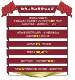 ——助力决战决胜脱贫攻坚。贯彻落实市委部署,主席会议成员继续带队帮扶安化大桥新村等10个贫困村,巩固脱贫成果,确保稳脱贫、不返贫。按照省市县三级联动原则,省市县三级政协共组建519个帮扶小组,结对帮扶519户贫困家庭,筹集资金568.43万元,继续强化产业帮扶,资助困难学生380人,帮助305名困难群众解决就业难题,实现稳定脱贫。