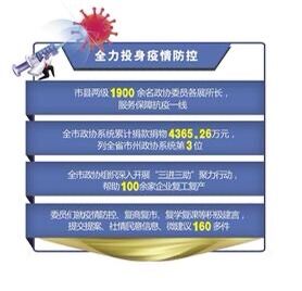 ——全力投身疫情防控。面对突如其来的新冠肺炎疫情,市政协迅速行动,先后2次发出倡议,紧急动员各级政协组织和广大委员,发挥政协优势,汇聚防控力量,与全市人民一道,同心战疫、共克时艰。市县两级1900余名政协委员各展所长,服务保障抗疫一线。医卫界委员白衣执甲、向险而行,奋战医疗救治最前线;广大委员心怀大爱、慷慨捐助,全市政协系统累计捐款捐物4365.26万元,列全省市州政协系统第3位;全市政协组织深入开展“三进三助”聚力行动,帮助100余家企业复工复产;委员们还就疫情防控、复商复市、复学复课等积极建言,提交提案、社情民意信息、微建议160多件。