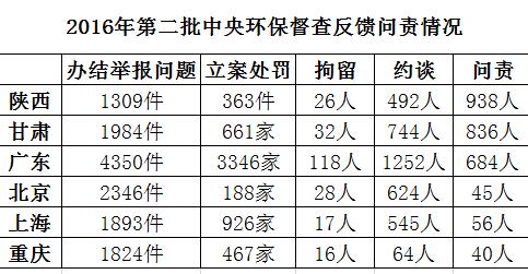 人民网北京4月14日电 2016年第二批环保督察工作于去年11月底启动,7个中央环境保护督察组分别进驻北京、上海、湖北、广东、重庆、陕西、甘肃等7省(市)开展为期1个月左右时间的环保督察工作。截至本月13日,环保部已公布对北京、上海、广东、重庆、陕西、甘肃6省市的督查情况,这6地目前已问责2599人。