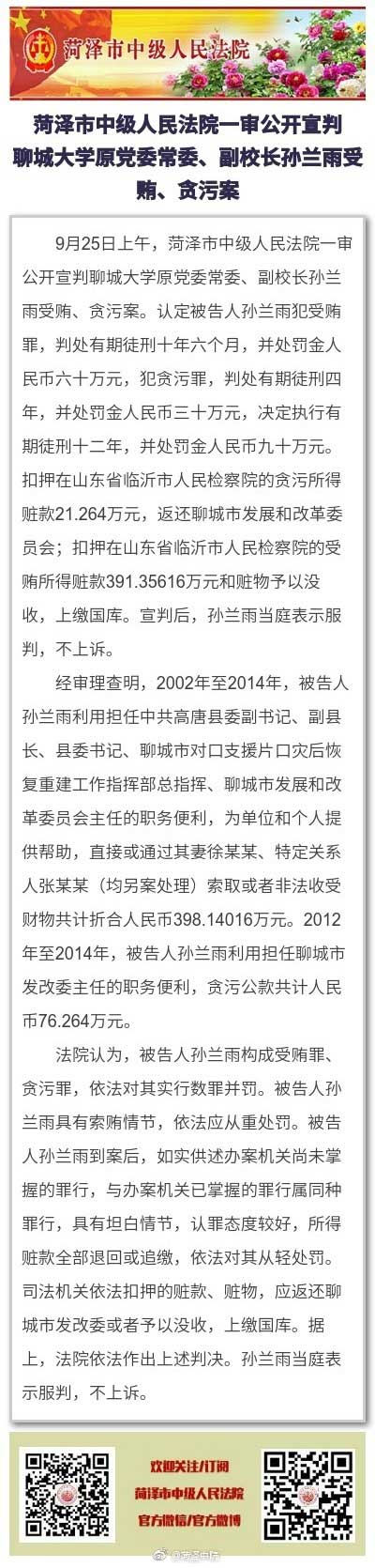 人民网北京9月25日电 据山东省菏泽市中级人民法院官方微博消息,9月25日上午,菏泽市中级人民法院一审公开宣判聊城大学原党委常委、副校长孙兰雨受贿、贪污案。认定被告人孙兰雨犯受贿罪,判处有期徒刑十年六个月,并处罚金人民币六十万元,犯贪污罪,判处有期徒刑四年,并处罚金人民币三十万元,决定执行有期徒刑十二年,并处罚金人民币九十万元。扣押在山东省临沂市人民检察院的贪污所得赃款21.264万元,返还聊城市发展和改革委员会;扣押在山东省临沂市人民检察院的受贿所得赃款391.35616万元和赃物予以没收,上缴国库。