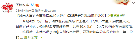 人民网北京12月1日电 据天津市人民政府新闻办公室官方微博消息,今晨4点07分,位于河西区友谊路与平江道交口的城市大厦38层发生火灾。目前火已扑灭,经现场反复清理检查,共有10人死亡,5人受轻伤正在医院救治。