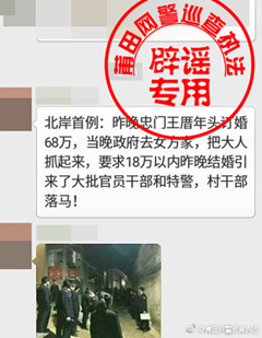 近日,网传视频中显示一些身着制服人员在婚礼现场进行检查,另有文字称“北岸首例:昨晚忠门王厝年头订婚68万,当晚政府去女方家,把大人抓起来,要求(订婚礼金)18万以内。昨晚结婚引来了大批官员干部和特警,村干部落马!”引发网民的关注和议论。很多人私信莆田网警求证传闻真伪。12月1日,莆田网警通报,据核实,近日北岸特警并无因网传事由出警的情况。