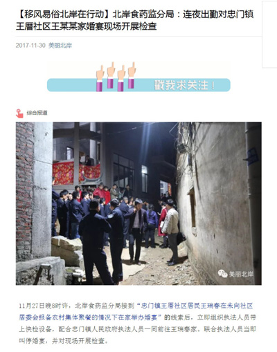 11月30日,北岸党工委宣传部通过官方微信号“美丽北岸”发布文章《【移风易俗北岸在行动】北岸食药监分局:连夜出勤对忠门镇王厝社区王某某家婚宴现场开展检查》对当天的情况予以说明。11月27日晚8时许,北岸食药监分局接到“忠门镇王厝社区居民王瑞春在未向社区居委会报备农村集体聚餐的情况下在家举办婚宴”的线索后,立即组织执法人员带上快检设备,配合忠门镇人民政府执法人员一同前往王瑞春家。联合执法人员当即叫停婚宴,并对现场开展检查。经检查,现场共开办酒席9桌,期间,执法人员重点就食品原料采购渠道是否合法正规、是否做好进货验收,食品制作过程是否有做好卫生安全防护工作等开展了检查,并随机抽查了厨师及协助阿姨的健康证明。