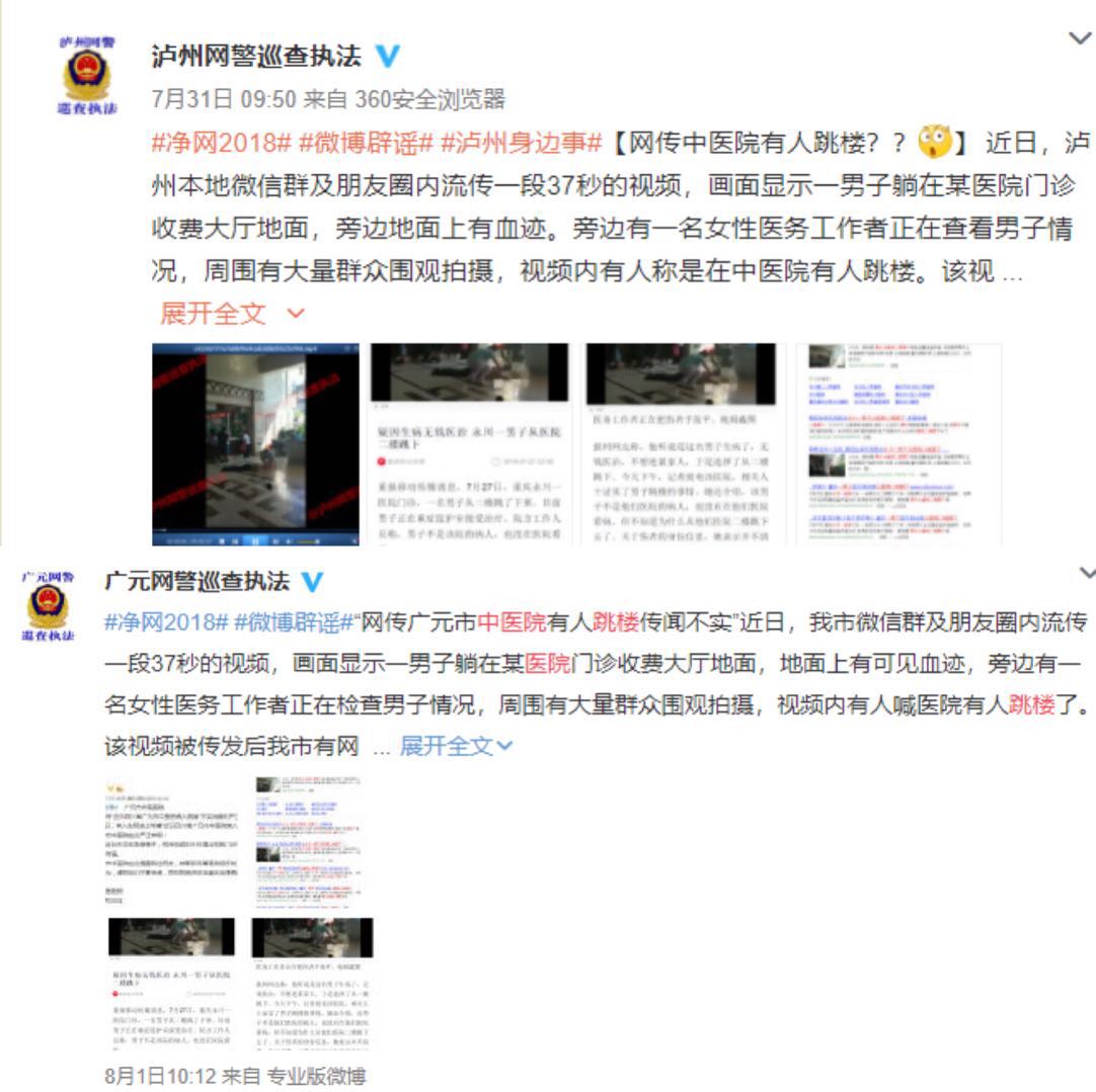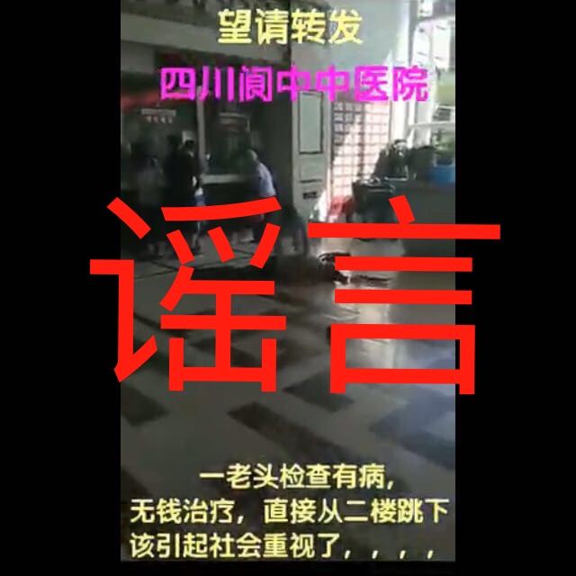 人民网北京8月3日电(孝金波 仇双)近日,一段男子在医院内跳楼的视频在四川阆中等多地热传,有的视频上还带有文字标注“望请转发,中医院一老头检查有病,无钱治疗,直接从二楼跳下该引起社会重视”。该视频经广泛传播后引发热议,随后阆中中医院及多地网警对此进行了辟谣。经核查,该视频场景发生地为重庆永川中医院。