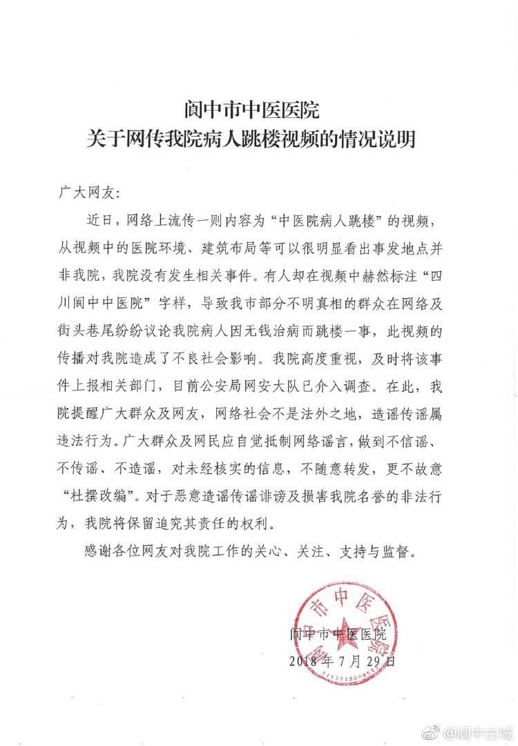 关于视频场景发生地的传言有四川阆中、广元、平昌、泸州等多个版本。四川阆中市中医院于7月29日发布声明称:“该视频中的医院环境、建筑布局等可以明显看出事发地点并非我院。该视频导致我市部分不明真相的群众在网络及街头巷尾纷纷议论我院病人因无钱治病而跳楼之事,对我院造成不良社会影响,现已上报相关部门,目前公安局网安大队已介入调查。”而泸州、广元等多地网警也对此进行了辟谣。