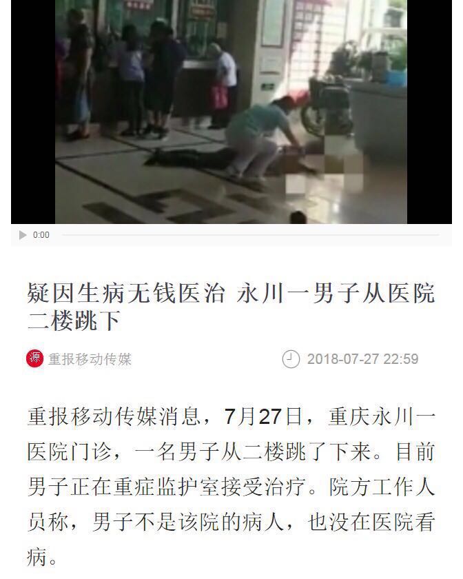 7月27号,重庆当地媒体有消息称一男子从重庆永川中医院门诊处二楼跳下。据称该男子并非该院病人,未在永川中医院进行任何门诊挂号、住院办理等情况。经“求真”记者核实,报道中的视频与网传视频一致,记者于8月3日致电永川市中医院,院方工作人员确认跳楼事件发生在该院,并称该院医护人员随后便将该男子送入重症监护室抢救,目前已被其家属接回,其具体伤情院方并未透露。