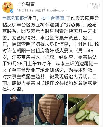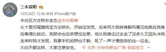 人民网北京11月6日电(孝金波 曹佳慧)近日,有一名女网民在微博上发消息称,在北京丰台区有一名男子尾随自己并裸露下体,此事引起警方注意。