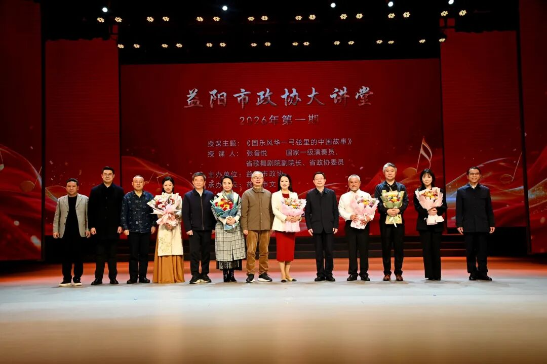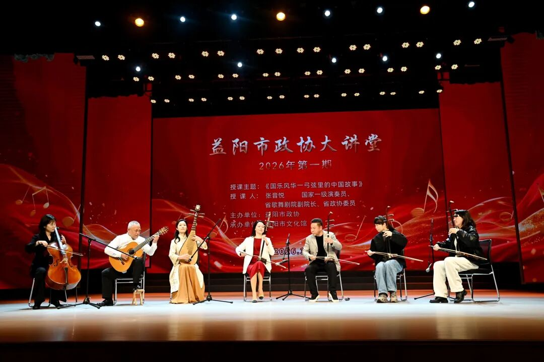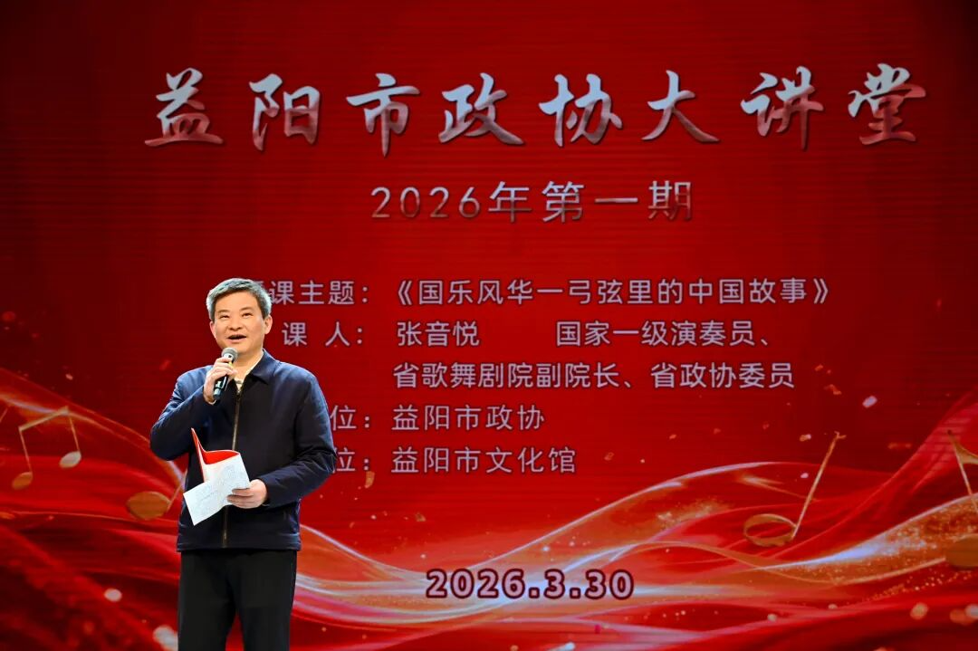 3月30日下午,益阳市政协大讲堂2026年第一期在市文化馆正式开讲。本次大讲堂以《国乐风华——弓弦里的中国故事》为主题,邀请国家一级演奏员、省歌舞剧院副院长、省政协委员张音悦主讲。近300名各界代表在悠扬的国乐声中聆听中华千年文脉。