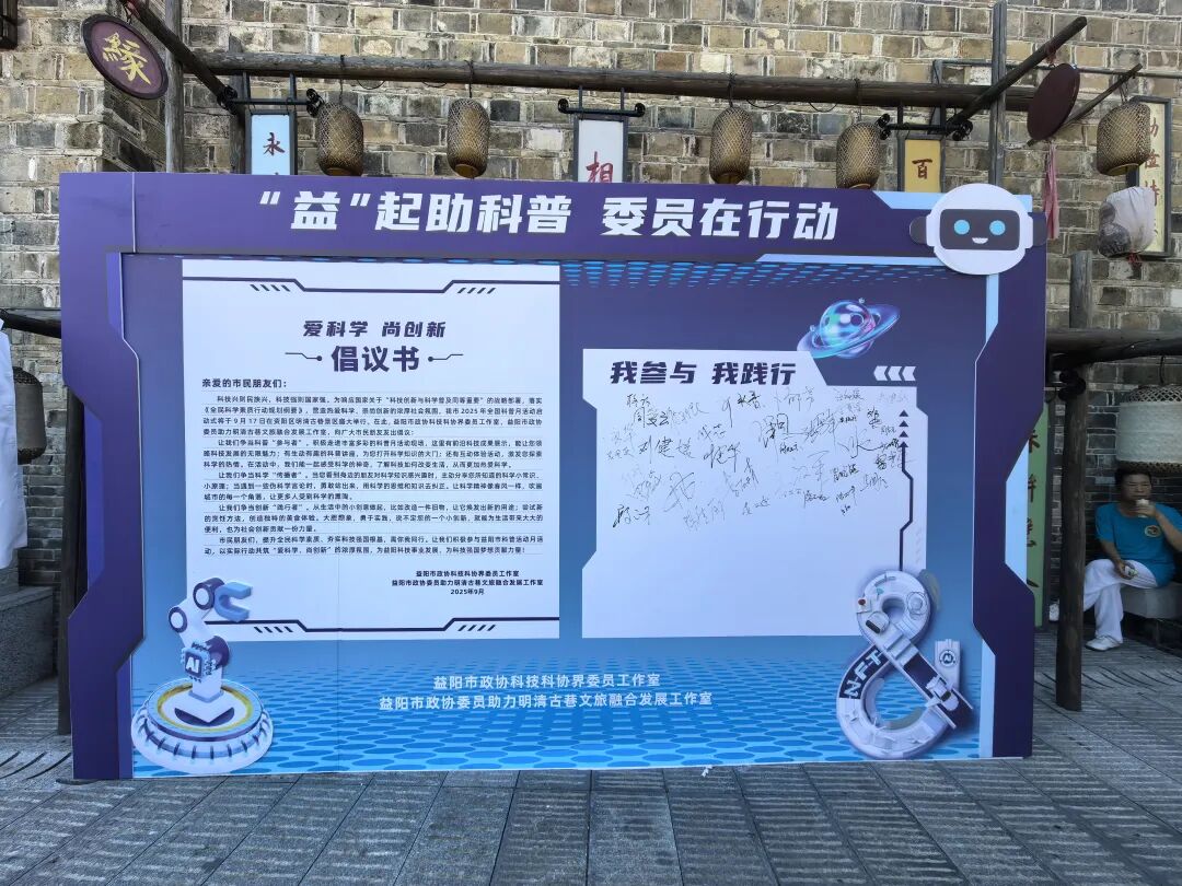 活动期间,市政协科技科协界委员工作室和市政协委员助力明清古巷文旅融合发展工作室联合发出“爱科学 尚创新”倡议书,呼吁市民积极投身科学普及:争做科普“参与者”,主动参与科学活动,感受科技魅力;争做科学“传播者”,积极分享科学知识,自觉抵制伪科学;争做创新“践行者”,勇于尝试日常小创新,为社会进步贡献力量。